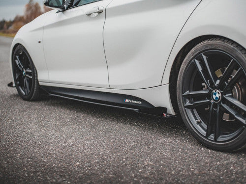 BMW 1 Series F20 side flaps. BMW F20 gloss black side skirt flaps. Maxton Design side flaps for M135i M140i. BMW F20 side skirt extensions. BMW 1 Series M-Pack side splitters. BMW F20 exterior styling and body kit parts 2011 to 2019.
