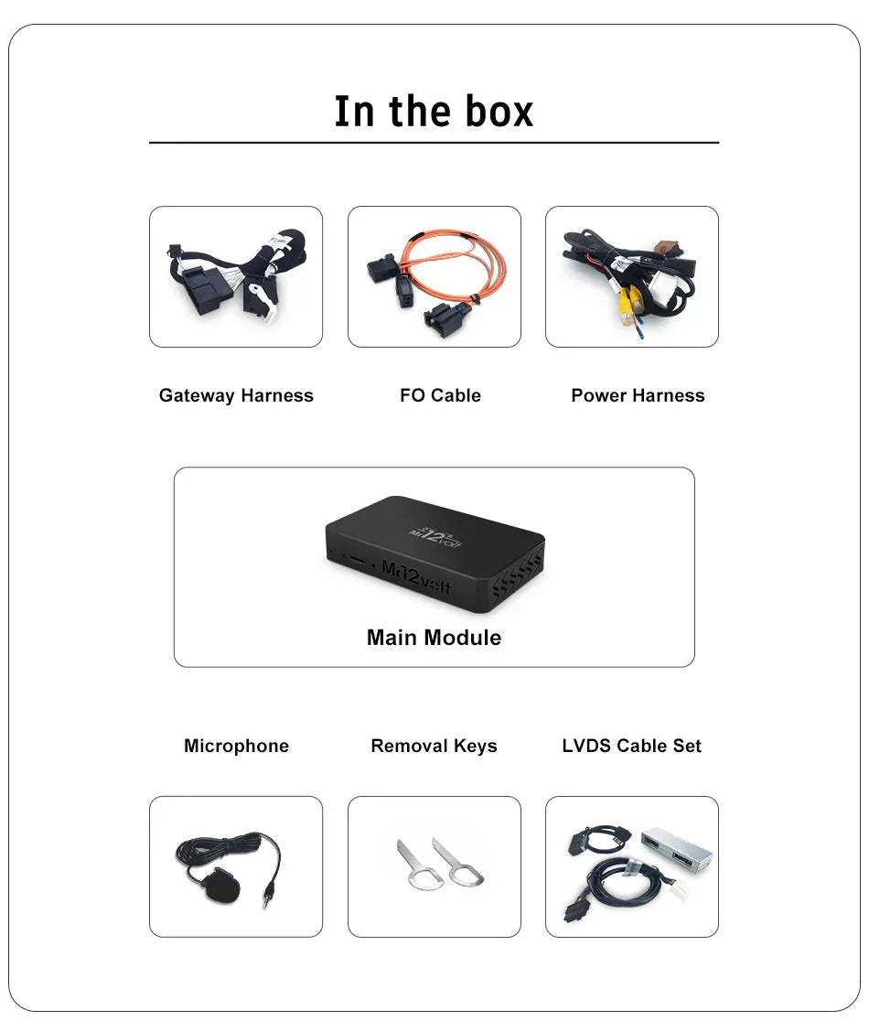Upgrade your Audi A6, Audi A8 or Audi Q7 MMI 2G High with the Mr12Volt P2000 LIGHTS 2G26ML Apple CarPlay and Android Auto interface. This plug and play retrofit uses the factory MOST fibre optic bus for outstanding sound quality and seamless OEM integration. Enjoy wireless Apple CarPlay, wireless Android Auto, wired CarPlay, wired Android Auto, Bluetooth handsfree, Bluetooth A2DP music streaming, Miracast screen mirroring, USB video and music playback, and camera inputs, all while keeping the original Audi controls, display and look.