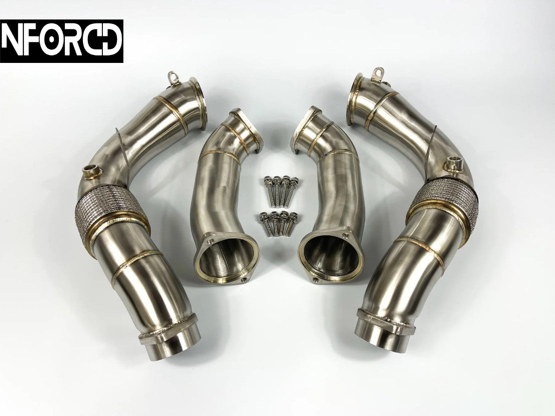 BMW X5M F95 decat downpipes, BMW X6M F96 decat downpipes, BMW X5M 3 inch decat downpipes, BMW X6M 3 inch decat downpipes, BMW X5M catless downpipes, BMW X6M catless downpipes, BMW X5M F95 downpipes 2021, BMW X6M F96 downpipes 2021, OPF GPF downpipes BMW X5M, OPF GPF downpipes BMW X6M, T304 stainless steel downpipes, TIG welded downpipes, mandrel bent downpipes, performance exhaust upgrade BMW X5M, performance exhaust upgrade BMW X6M, straight through downpipes BMW X5M, straight through downpipes BMW X6M.