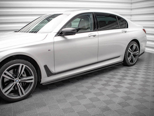 BMW 7 Series G12 side skirts, BMW G12 side skirt diffusers, BMW 7 Series Long Wheelbase M Sport side skirts, Maxton Design BMW 7 Series side skirt extensions, gloss black side skirt splitters BMW G12, BMW 7 Series G12 body kit side skirts, BMW G12 LWB M Pack styling, BMW G12 aero side skirts, BMW 7 Series sill extensions.