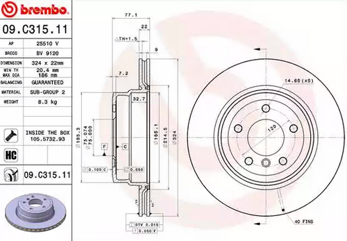Brembo 09.9573.11 Coated Disc Line Brake Disc Rotor for BMW X3 (E83) - Internally Vented, High-Carbon, Anti-Corrosion Coated, 320x22mm, 5-Hole, with Bolts/Screws