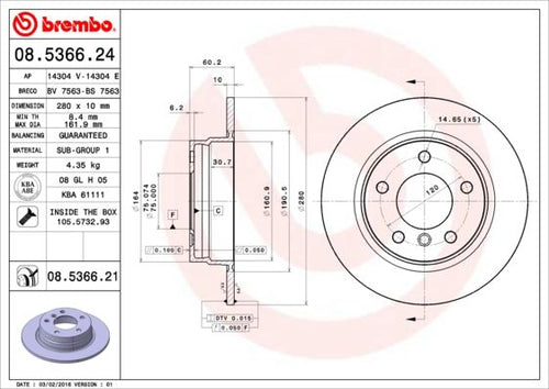 Brembo 08.5366.24 Brake Disc Rotor for BMW 3 Series, Solid 280 x 10 mm, 5-Stud, Includes Bolts/Screws, OEM Quality Replacement