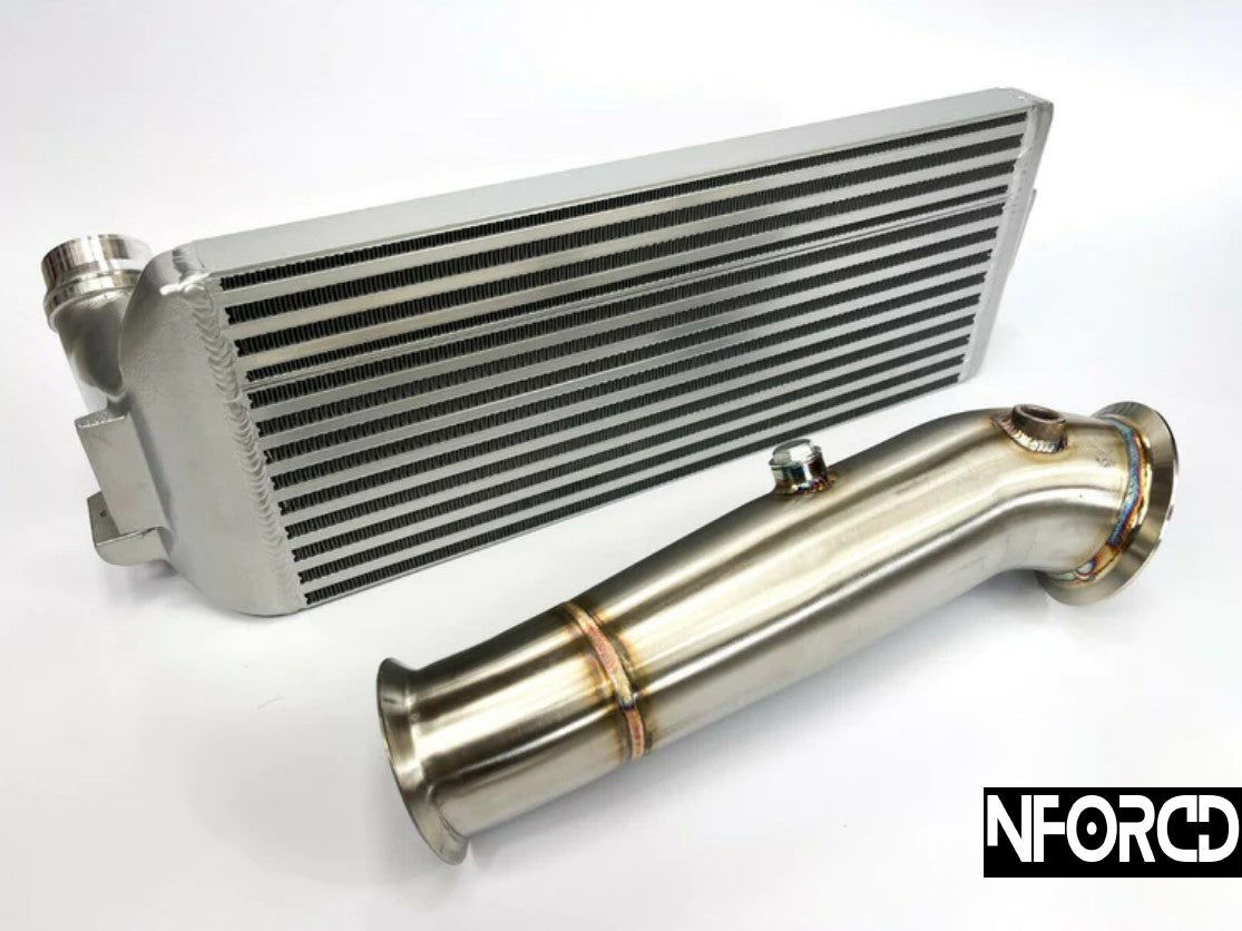 BMW N55 intercooler, BMW N55 downpipe, BMW N55 decat, BMW catless downpipe N55, BMW M135i intercooler, BMW M135i downpipe, BMW M235i intercooler, BMW M235i decat, BMW M2 N55 intercooler, BMW M2 N55 downpipe, BMW 335i intercooler upgrade, BMW 435i decat downpipe, front mount intercooler FMIC N55, 5 inch competition intercooler, bar and plate intercooler, flowed cast end tanks, T304 stainless downpipe, TIG welded, mandrel bent, plug and play, direct fit, performance upgrade, lower IATs, faster spool, aggressive exhaust note.