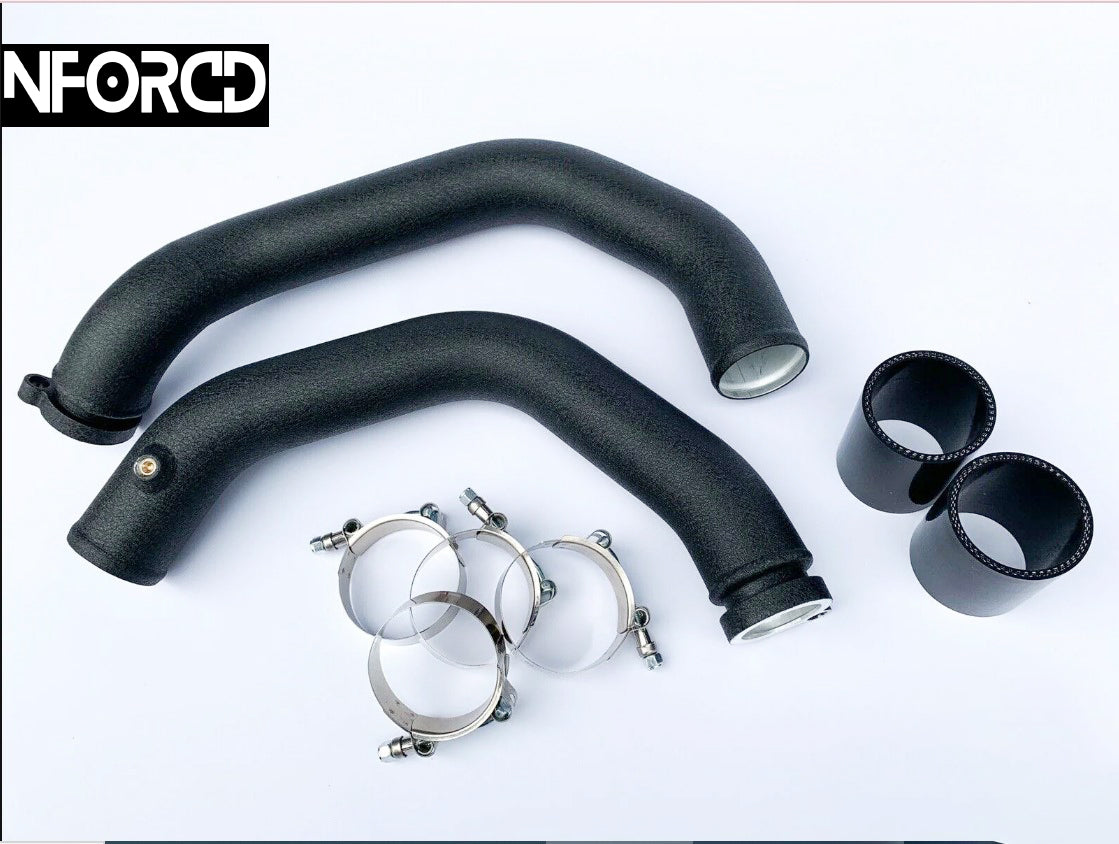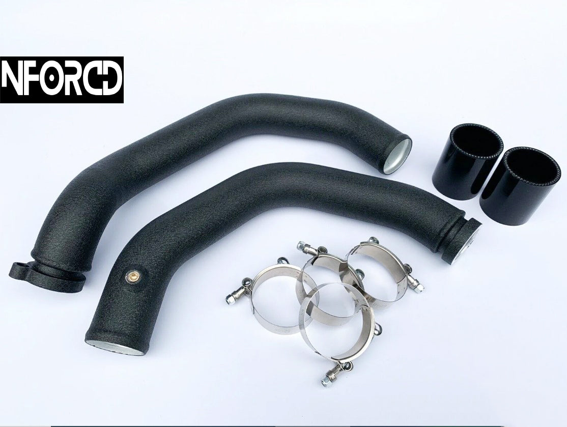 Both charge pipes include a single port for methanol or water injection, giving you straightforward expansion options. Finished in a durable crinkle black powder coat, these S55 boost pipes look factory-neat while delivering proven performance. We have installed and used these kits in-house at Nforcd, and customer feedback has been consistently positive for response and driveability. On-road testing has shown gains of approximately 12 to 15 bhp.