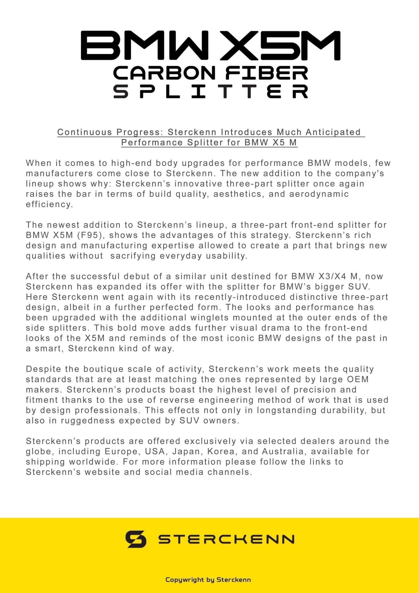 Order the Sterckenn Carbon Fibre Front Lip for BMW X5M F95 today and give your X5M the OEM plus front end it deserves.